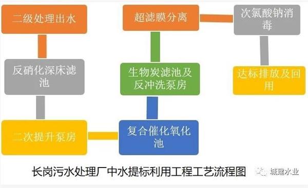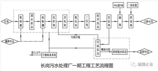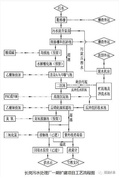 為達到環保部門要求的水質,長崗污水處理廠尾水進行了提標改造,具體工藝如下: