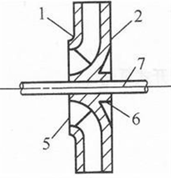 1一前蓋板;2一后蓋板;3一葉片;4葉槽;    1一吸人口;2一輪蓋;3一葉片5一吸水口;6一輪轂;7一泵軸    4一輪轂;5一軸孔